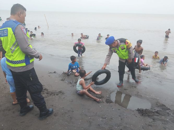 Personel kepolisian tampak aktif melakukan pemantauan situasi, membantu pengaturan arus pengunjung, serta memberikan imbauan secara persuasif kepada wisatawan agar tetap memperhatikan faktor keselamatan selama beraktivitas.
