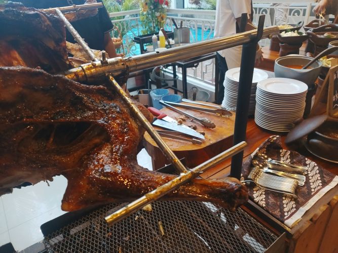 Restoran menyajikan lebih dari 70 variasi menu yang mencakup makanan pembuka, hidangan utama, serta aneka pencuci mulut. Salah satu menu yang menjadi daya tarik adalah kambing guling yang disiapkan langsung oleh tim dapur hotel.